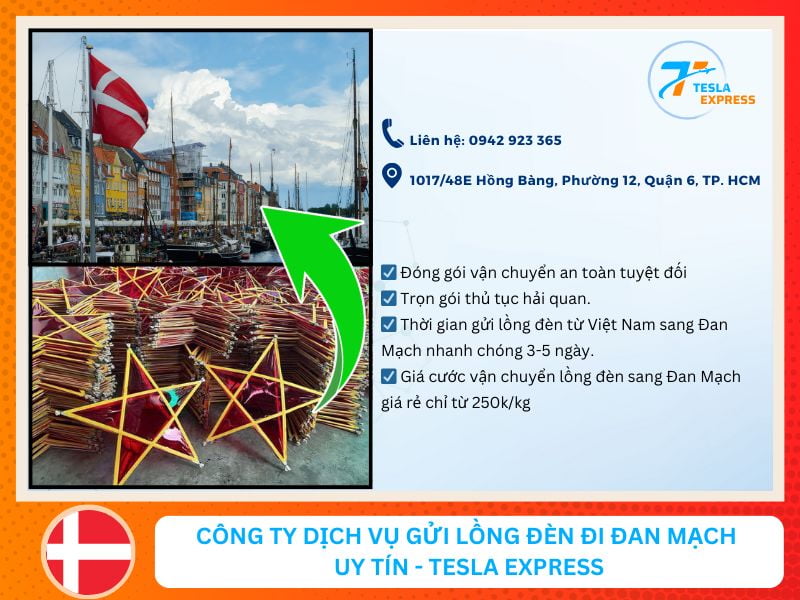 Vận chuyển lồng đèn sang Đan Mạch là dịch vụ chuyên biệt đòi hỏi sự uy tín, chuyên nghiệp và hiểu biết sâu về thủ tục logistics quốc tế. Liên hệ ngay Tesla Express qua hotline 0942 923 365 để được trải nghiệm giải pháp vận chuyển lồng đèn từ Việt Nam sang Đan Mạch trọn gói; đáp ứng từ đóng gói, làm giấy tờ, hỗ trợ hải quan, giao hàng tận nơi an toàn, ship nhanh chóng từ 3-5 ngày bằng đường hàng không, và giá tiết kiệm chỉ từ 250k/kg.